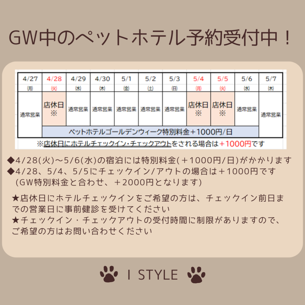 🐶🐱GWのホテルご予約受付中です!! ♦4/27(月)~5/6(水)をGW期間とさせていただきます。 宿泊には特別料金+1000円/日がかかります。 ♦4/28(火)・5/4(月)・5/5(火)は休店日です。 休店日にチェックイン、チェックアウトの場合は+1000円です。 (GW特別料金と合わせ、➕2000円となります) ★店休日はチェックイン、チェックアウトの時間に制限がありますので、ご希望の方はお問い合わせください。 ※部屋数に限りがございます。 ご予定がお決まりの際は早目の予約をお勧め致します。